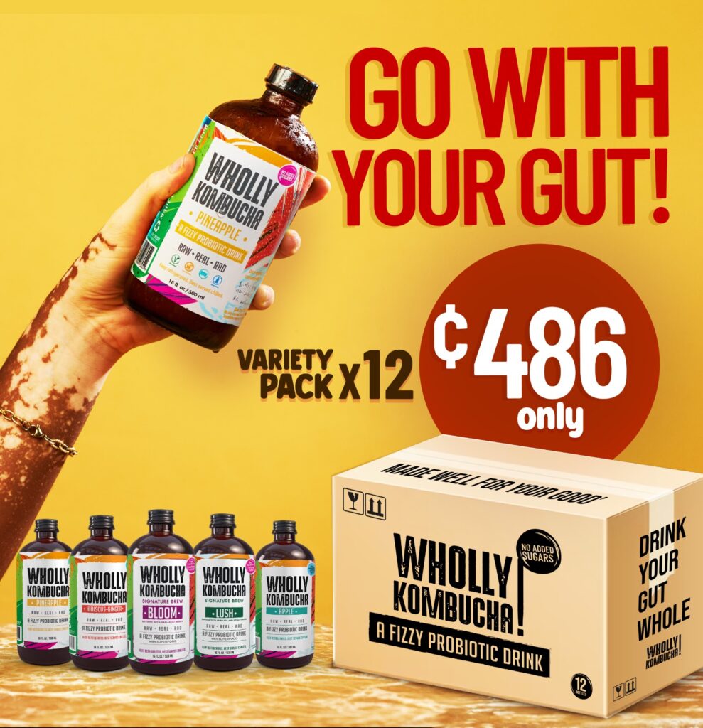 Fuelled by years of passion and dedication to culturing foods, including brewing Kombucha, Nana Pokua Owusu-Sekyere (Founder of Wholly Kombucha) was inspired by the transformative benefits of Kombucha on her health, and eagerly decided to introduce this ancient elixir to the Ghanaian market.